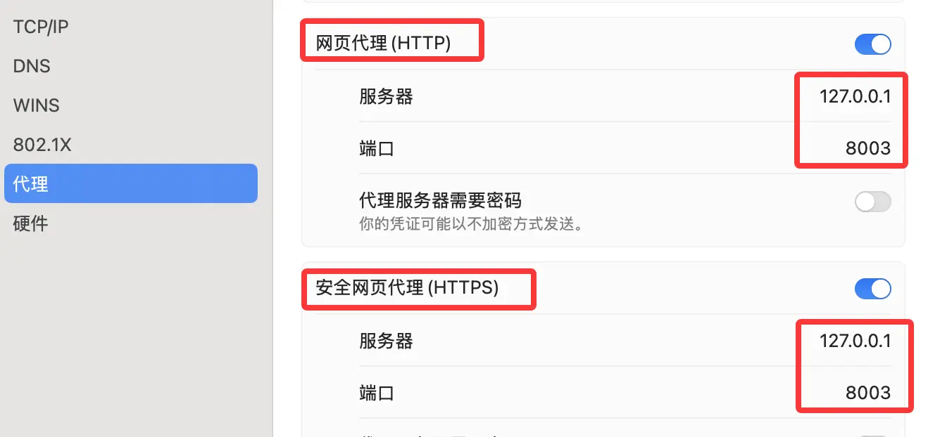 "系统设置"-"网络"-"详细信息"-"代理" 查看 "网页代理(HTTP)"和"安全网页代理(HTTPS)"选项是否打开,代理IP 和端口是否与 Clash Verge 的代理 IP 和端口一致。